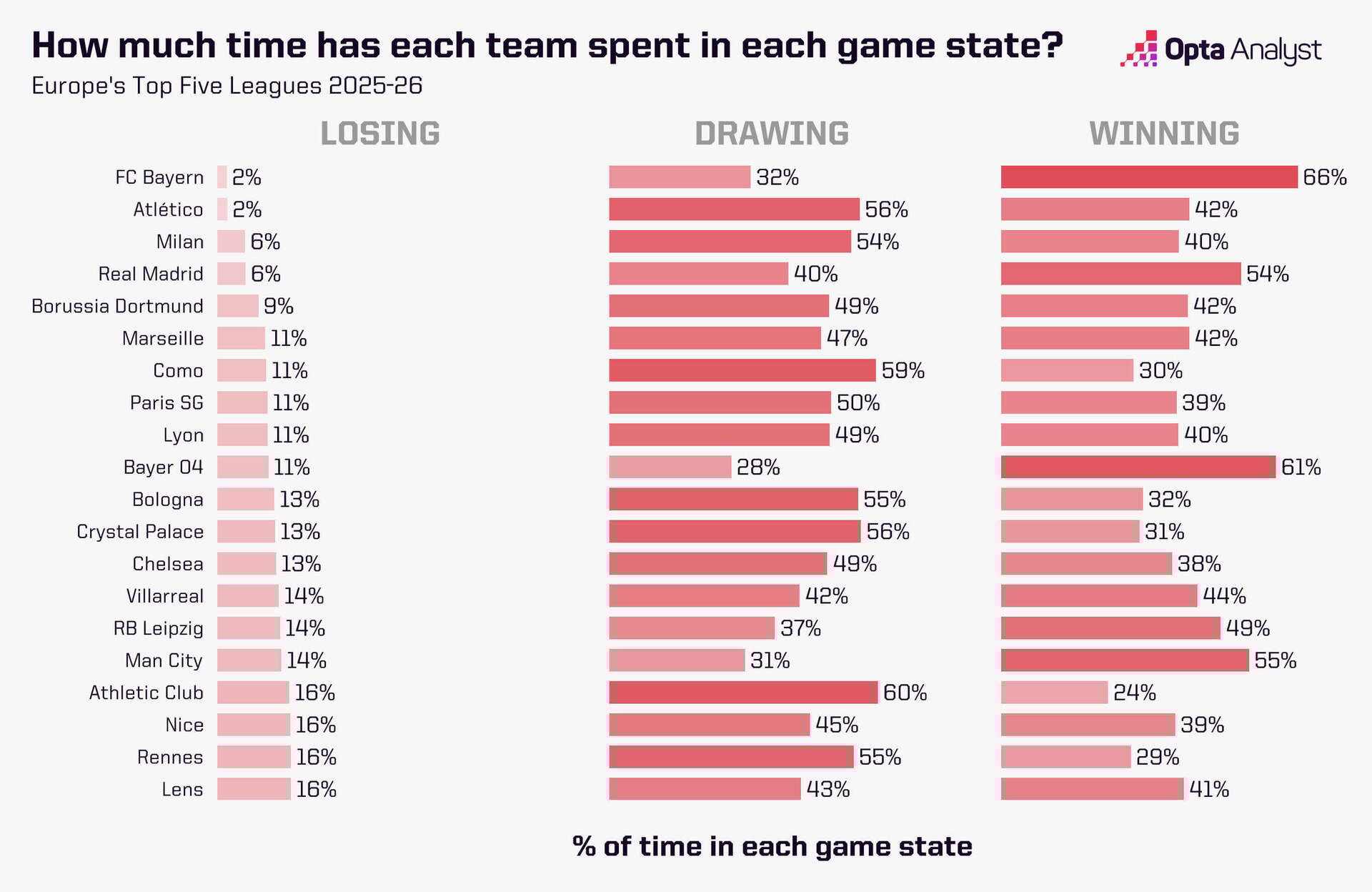 In fact, the only team in Europe’s top five leagues to have spent longer in any game state than Bayern have winning is Parma drawing (68.4%).