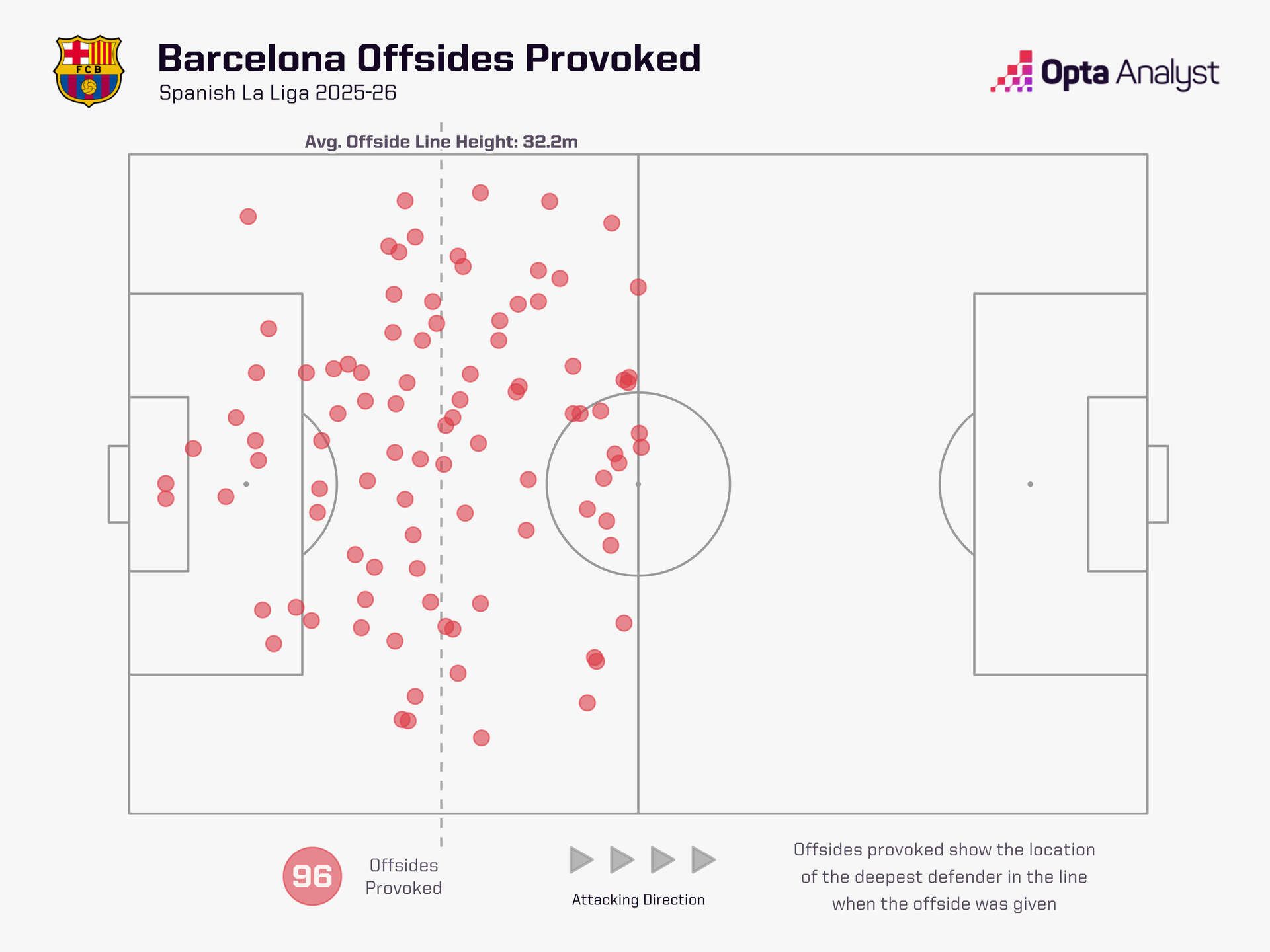 Across Europe’s top five leagues, Barcelona are way out in front. The La Liga giants have forced an astonishing 96 offsides, an average of 5.05 per game. No other team in Europe’s top five leagues has an average of more than 3.63 per game (Athletic Club).