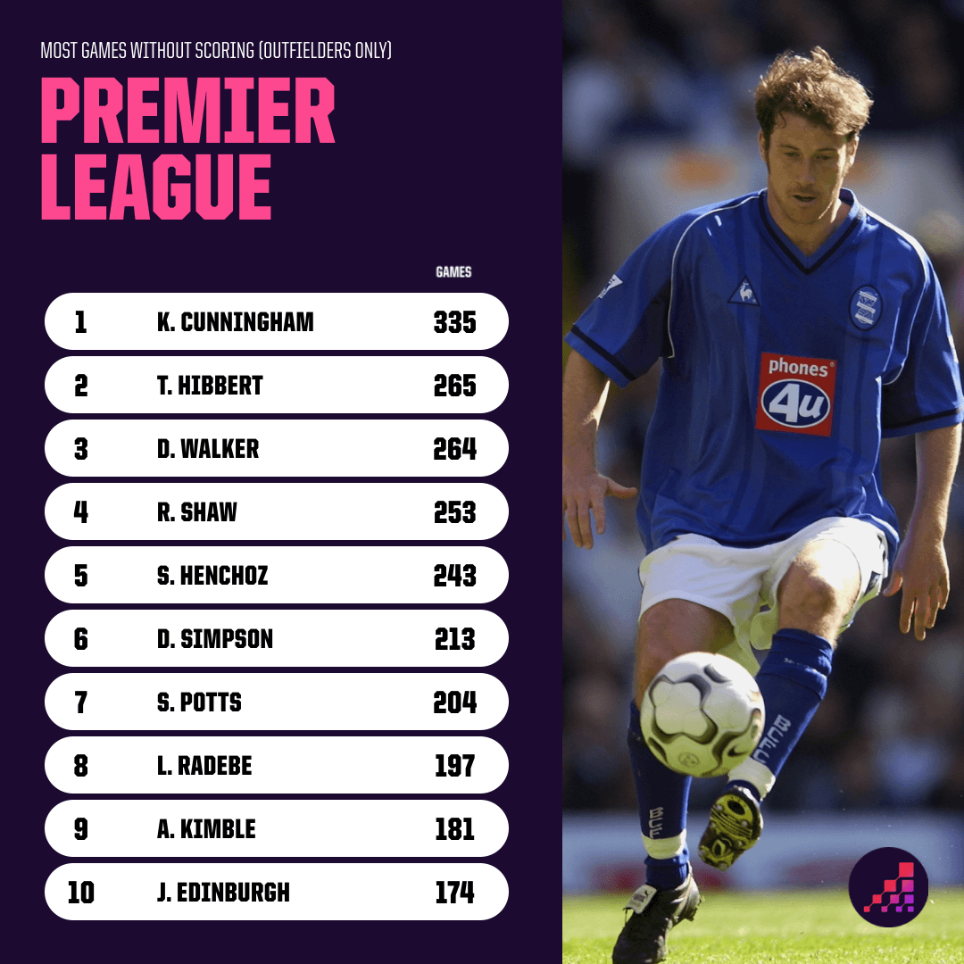 In terms of just Premier League games, the player to have featured the most in the competition without finding the net is Kenny Cunningham. The Republic of Ireland international played 335 Premier League games in total (201 for Wimbledon, 134 for Birmingham City) and did not score once.