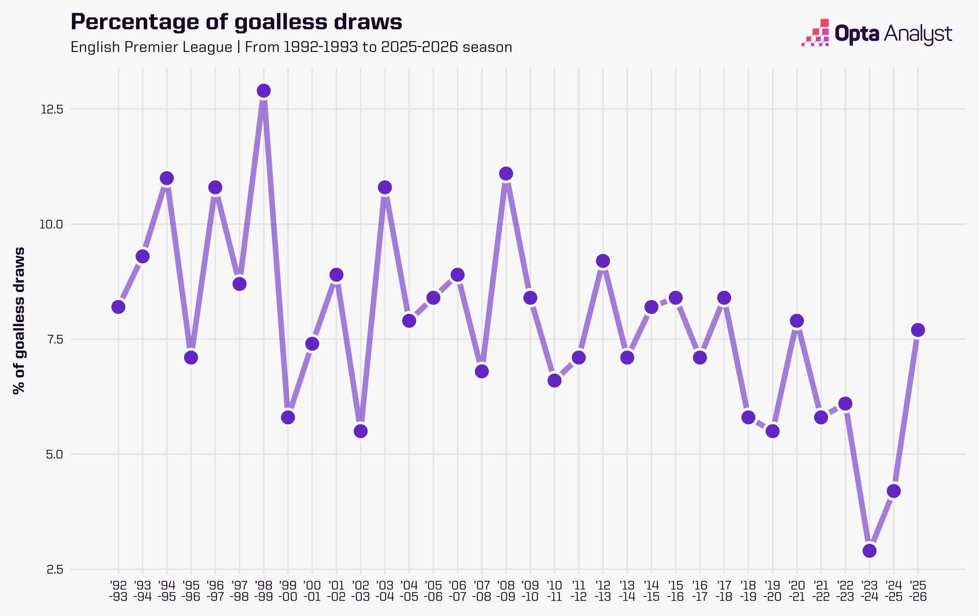 Of special interest to us, though, is the subject of 0-0 draws. We really didn’t see many of them in the last two seasons, with just 11 in 2023-24 (2.9%) and 16 in 2024-25 (4.2%), the two lowest totals in Premier League history. Prior to that, there had never been fewer than 21 in a single season in the competition (5.5%).