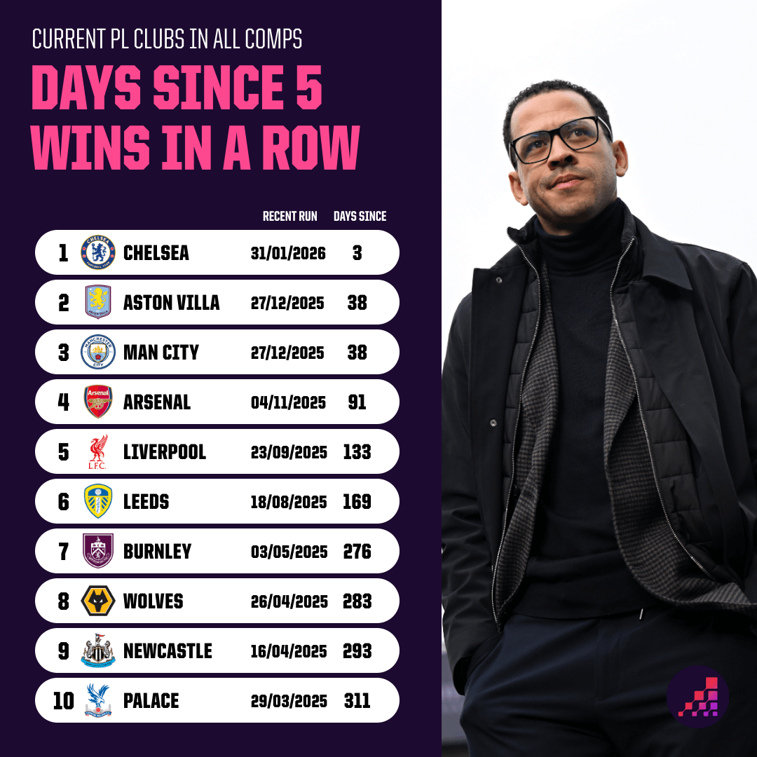 First, some bad news for United Strand. His hair should be even longer. Manchester United are currently on a run of 715 days without winning five consecutive matches in all competitions – the seventh-longest ongoing streak among current Premier League sides.