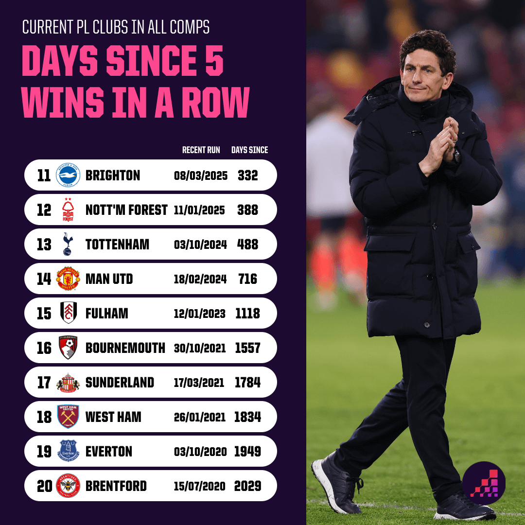If you’re looking for the longest locks of all, spare a thought for Brentford supporters. The Bees last won five games in a row in August 2020, when they were still in the Championship. That was 2,029 days ago. An extraordinary head of hair awaits anyone committed enough to see that challenge through.