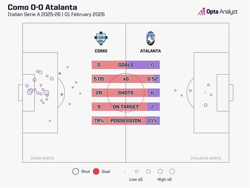As the shot map below shows, after visitors Atalanta were reduced to 10 men early on, Como dominated. Over 90 minutes, they racked up a whopping 5.05 expected goals.