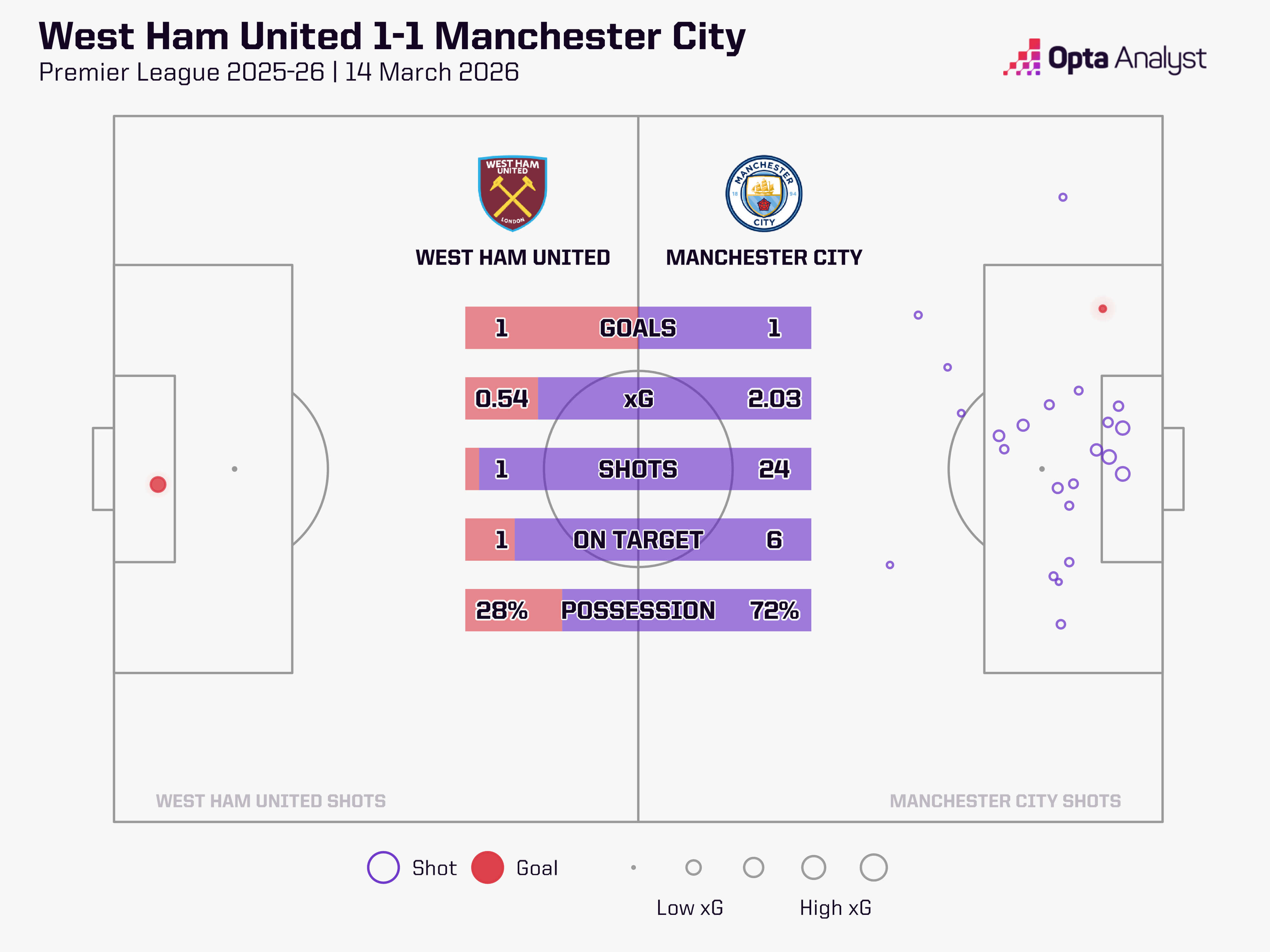 No team had recorded fewer than three shots in a Premier League match this season prior to the weekend, but Mavropanos’ header was the only effort the Hammers managed all game. It was an important one, though, as it secured them a 1-1 draw.