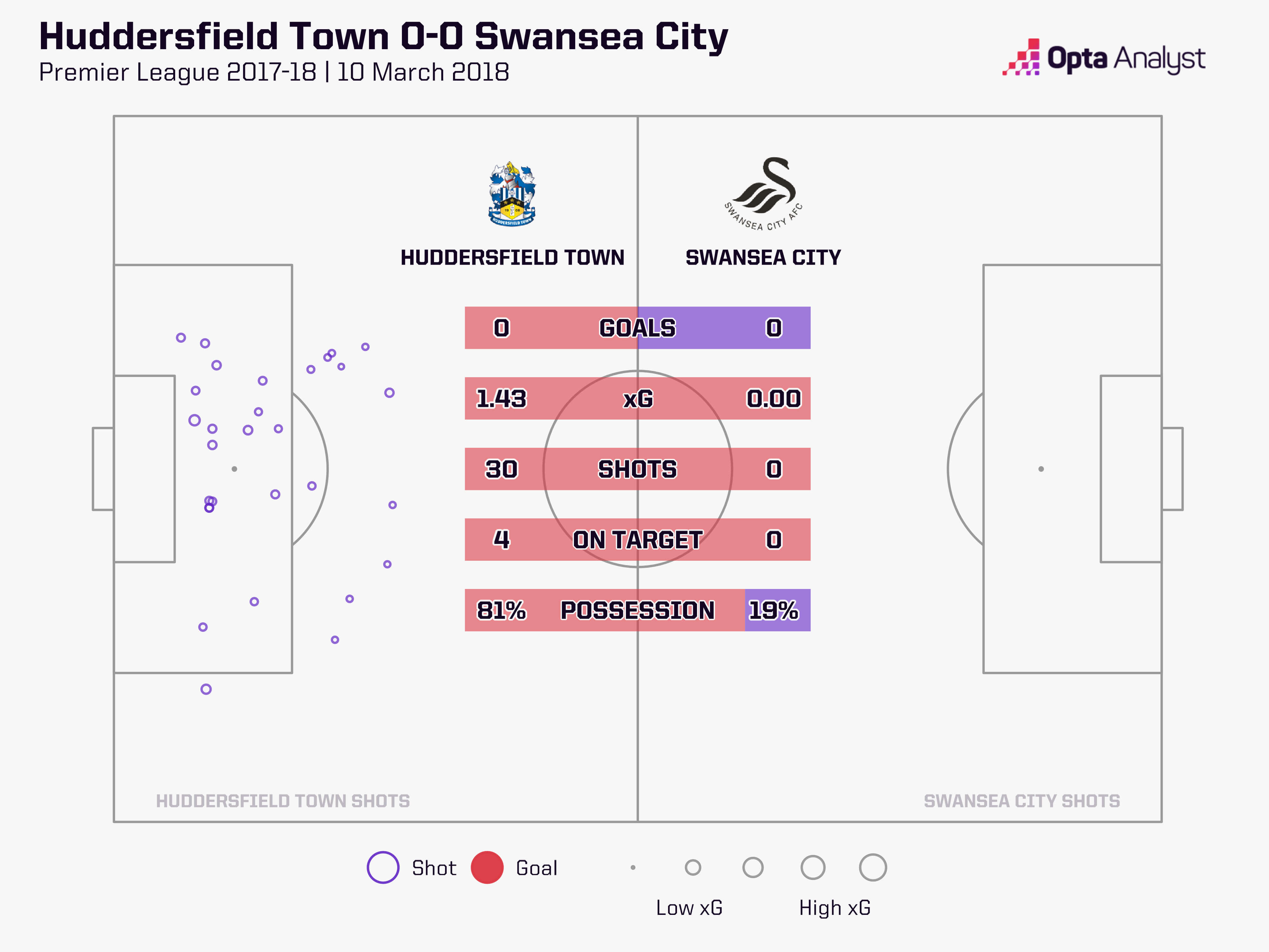 Then in March 2018, Huddersfield Town hosted Swansea City, with the Welsh side reduced to 10 men in just the 11th minute when Jordan Ayew was sent off. This led to total domination from the hosts, who had 30 shots to Swansea’s zero. However, the visitors were able to hold on for a 0-0 draw.