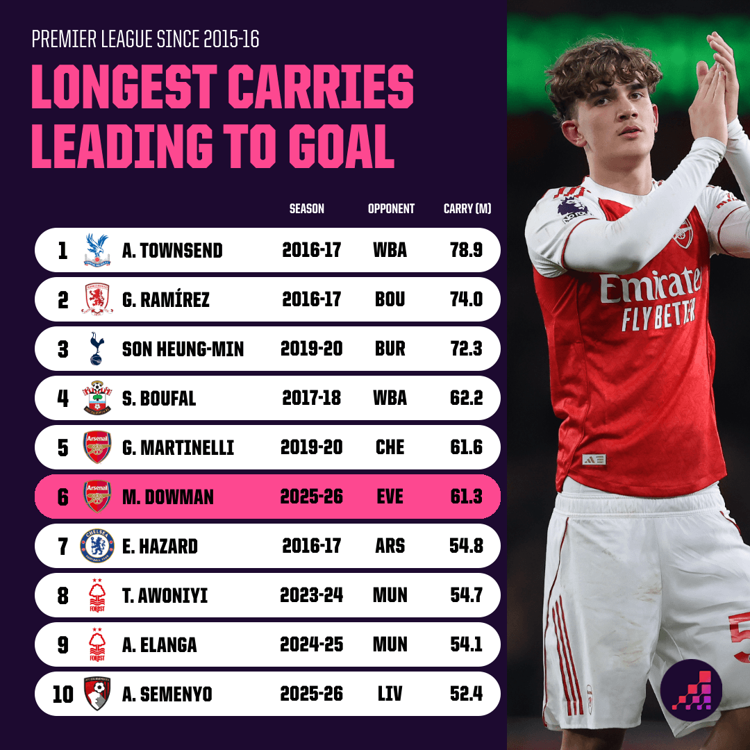 His goal was the headline moment, but Dowman had already changed the game after coming on with 15 minutes remaining. Despite being brought on in the 74th minute, he completed more dribbles (five) than any other player on the pitch against Everton, underlining how direct and progressive he was whenever he received the ball.