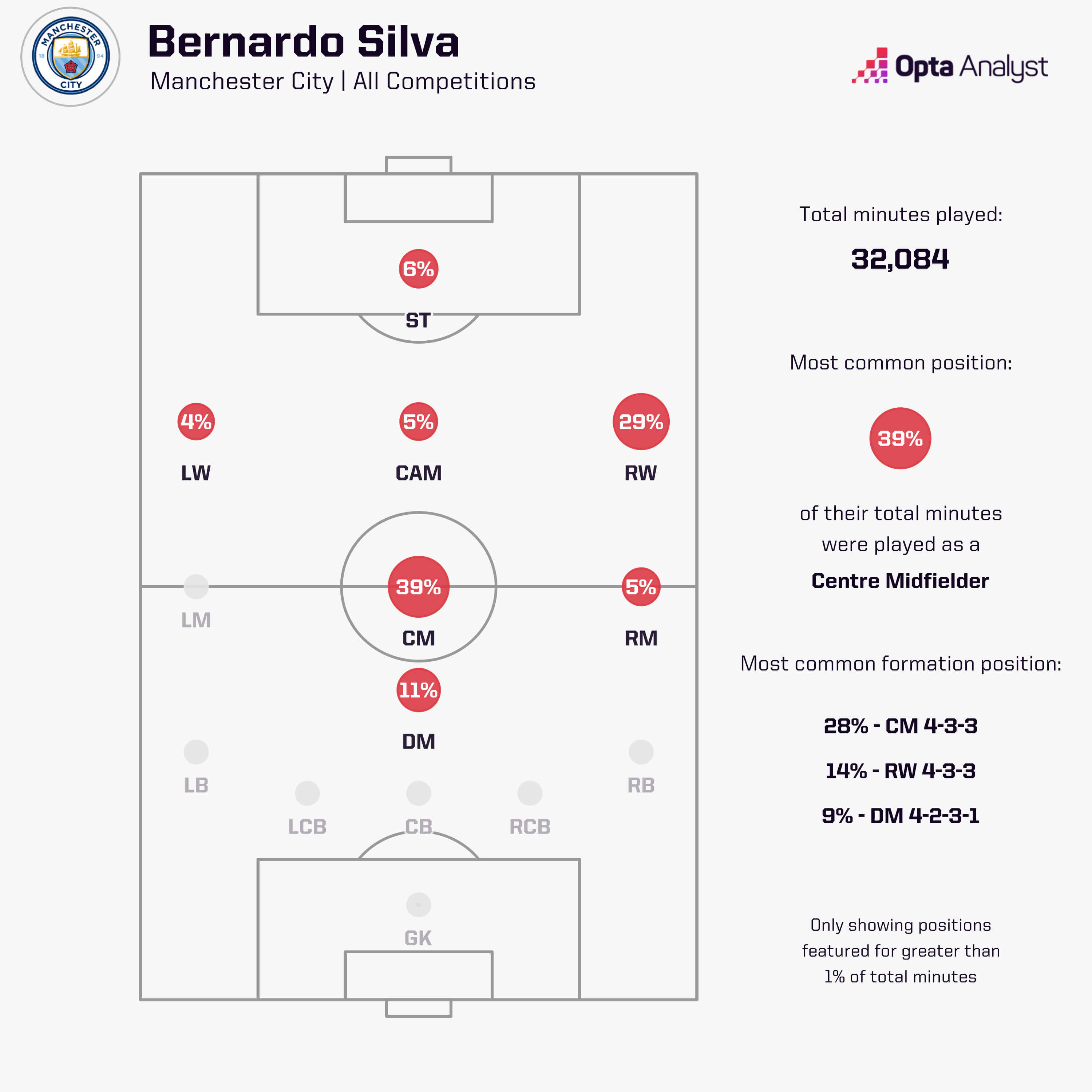 In his time at Man City, Bernardo has played in multiple positions, but as you can see from his position map below across all competitions in the last nine seasons, he has predominantly played in centre midfield (39%), with his second-most common position being on the right wing (29%).